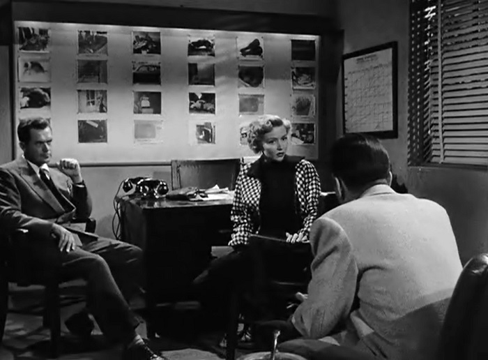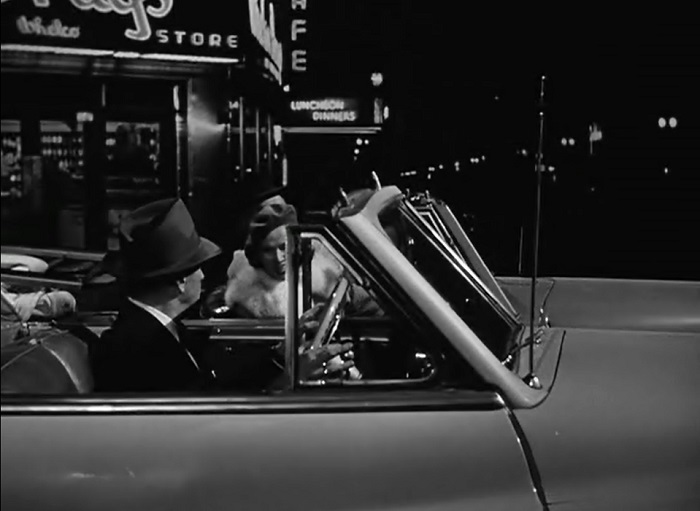 На самом деле детективная интрига и вообще криминальный сюжет здесь полностью уходят на второй план с момента признания в любви голубков, то есть, где-то с сороковой минуты. Далее идет чисто драматическая история взаимоотношений двух персонажей, один из которых страдает неустранимой склонностью в саморазрушению. Конечно, его припадки ненависти и ярости изображены, пожалуй, чересчур уж утрированно, ну да ладно. В целом это работает и мы получаем яркую и сложную человеческую драму в интересном оформлении - нуар, Голливуд начала 50-х, своеобразная атмосфера творческой коммерции, столь любимая американскими режиссерами (привет Коэнам), типичные саркастичные диалоги и гонки на шевролетах. Жаль только, нуарная эстетика в мелодраматической части сильно спадает.