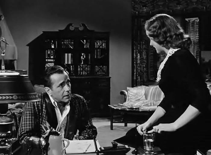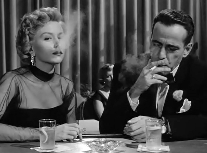 Итак, очередной культовый нуар с Хамфри Богартом. Он, как всегда, крутой мужик, который не лезет за словом в карман и умеет работать кулаками. Внешне спокойный, саркастичный, знающий все недостатки мира и смирившийся с этим, он уже в первых своих сценах демонстрирует свой тяжелый порок - необъяснимую вспыльчивость. Объяснения ей так и не придумали, но сам образ равнодушного циника-трикстера, который в глубине души хранит верность идеалам гуманизма, одновременно сохраняя глубоко противоречащее этому чувство эгоцентричности, доходящее до ненависти при ничтожным поводам - схвачен очень хорошо, ничего лучше на моей памяти я пока не видел. Разумеется, его жизнь кардинально меняется, когда он наконец встречает свою любовь, которую наверняка давно отчаялся встретить - умную, самостоятельную, красивую женщину. И именно эта история, благодатная для психоанализа и разборов находок сценария и режиссуры, составляет успех этого в чем-то типичного, а в чем-то нет нуарного фильма. Нетипичного в основном тем, что обычно мелорама в нуаре мне не нравится - но тут она работает на все сто.