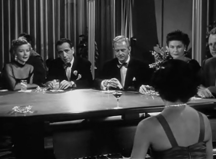 Нуарной эстетики тут действительно очень много, особенно в начале. Очередная ночная поездка на огромных американских машинах через каменные джунгли города, тьма, полутени, дорогие черные костюмы, атмосфера коммерционализированного Голливуда, роковые красотки, нуарная музыка, постоянное употребление алкоголя и табака... Кстати, в этом кино предоставление сигареты играет совершенно четкую роль интимного жеста - ее передают друг другу Диксон и Лорен в своих разговорах как знак внимания. Отличная нуарная находка. Наводит на мысли, не этим ли вдохновлялся Тарантино в "Криминальном чтиве" в сцене в ресторане... А то это далеко не первый нуарный след, что я у него вижу...