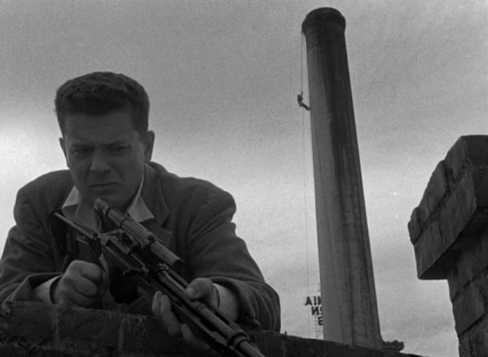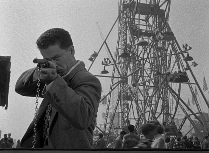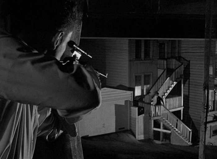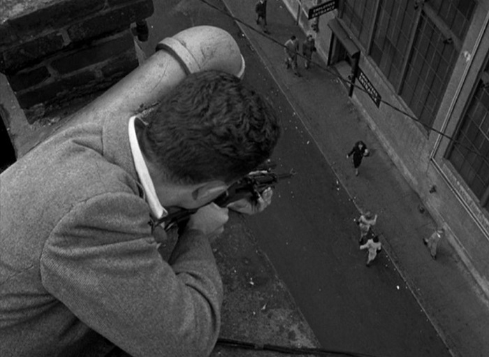 Но в тот момент талант еще был, так что по части постановки кино сделано хорошо. Особенно для фильма, который снят за 18 дней почти целиком на натуре - даже по тем временам молниеносно. Конечно, чувствуется, что это малобюджетная постановка, которой не хватает масштаба, ночных сцен, пафосных декораций, изобретательности в приемах, вместо которых ставка на реализм... Но все же творческий почерк Дмитрыка чувствуется часто, особенно поначалу. Местами можно узнать прежние мотивы из "Загнанного" и "Перекрестного огня" - последнего "Снайпер" уделывает с лихвой. Нуара, правда, не сказать, чтобы много, даже наоборот - все же действие в основном идет днем. Но есть и ночные кадры депрессии главного героя, и преследование жертвы, и силуэты убийцы, и городской лабиринт убитых трущоб, и даже парочка-другая весьма мощных кадров и операторских планов. Да и тема психического сумасшествия изображена убедительно.