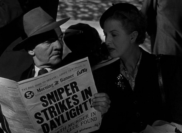 После того, как Дмитрык обжегся с Комиссией по антиамериканской деятельностью, было бы логично встретить в "Снайпере" полную деполитизацию. Благо, в годы маккартизма в нуаре это было нормой - нетрудно заметить, что если какие-то социальные намеки в нуаре 1940-х и проскальзывают, то в начале 50-х это улетучивается, как бензин на воздухе. Однако же нет! Ничего подобного! Это - самый остросоциальный и самый антиамериканский нуар Дмитрыка, а может, и один из самых антиамериканских нуаров в принципе. Предполагаю, что это достигнуто благодаря исключительно личности продюсера Стенли Крамера, который всю свою жизнь снимал остросоциальное кино и поднимал все неудобные темы - расизм, нацизм, ядерная война... А тут вот, выходит, маньяк и половые преступления. Я думаю, мы сейчас с очень большим трудом можем представить, каково было в 1952 г. снять фильм про полового маньяка, который крупным планом убивает женщин в кадре.